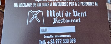 Amb Nostras Targetas Regal descobreix el Restaurant Moli de Vent a Garriguella, on oferim delicioses carns a la brasa i postres casolanes en un ambient familiar i acollidor. Veuen i gaudeix d'una experiència gastronòmica única amb nosaltres.